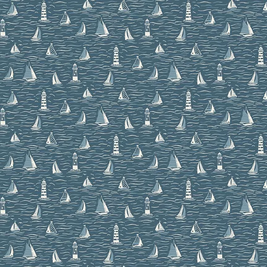 Sailing Blue aus der Serie Driftwood von Makower 172/B Segelschiffe und Leuchttürme auf blauem Hintergrund
