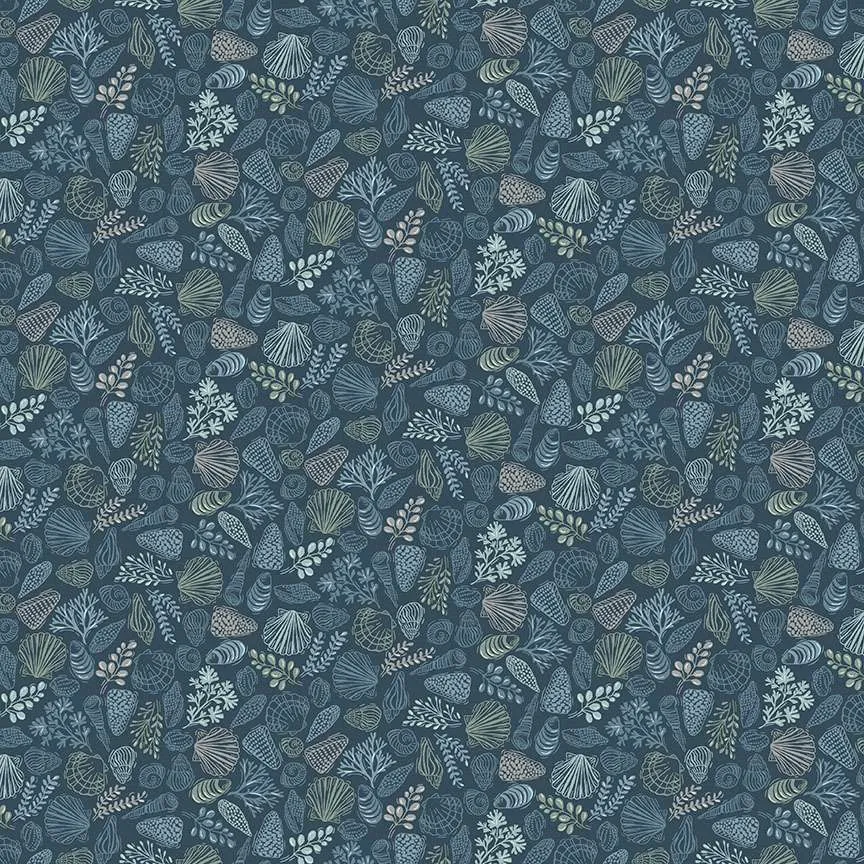 Shells Blue aus der Serie Driftwood von Makower Muscheln und Pflanzen allover auf blauem Hintergrund